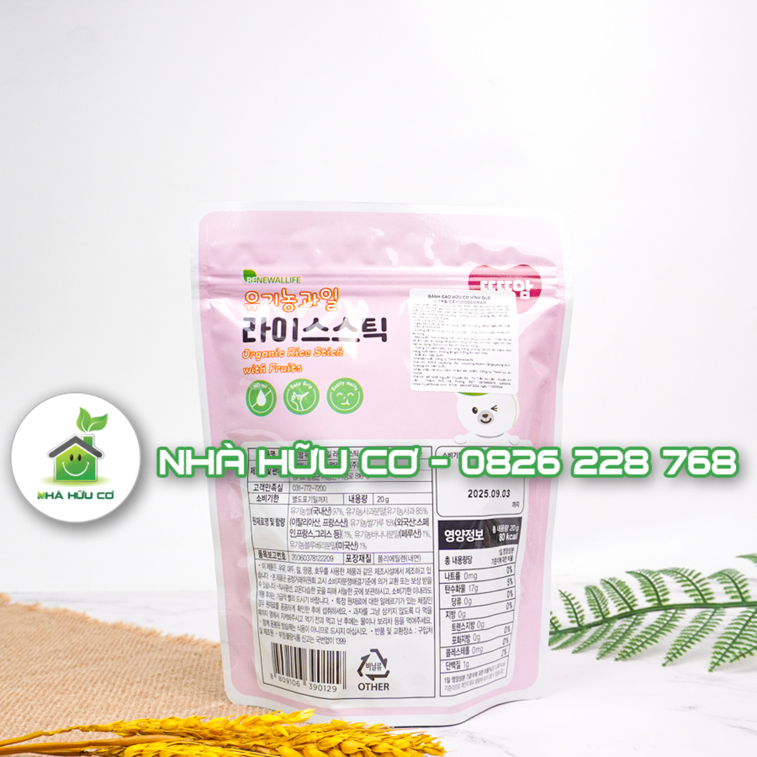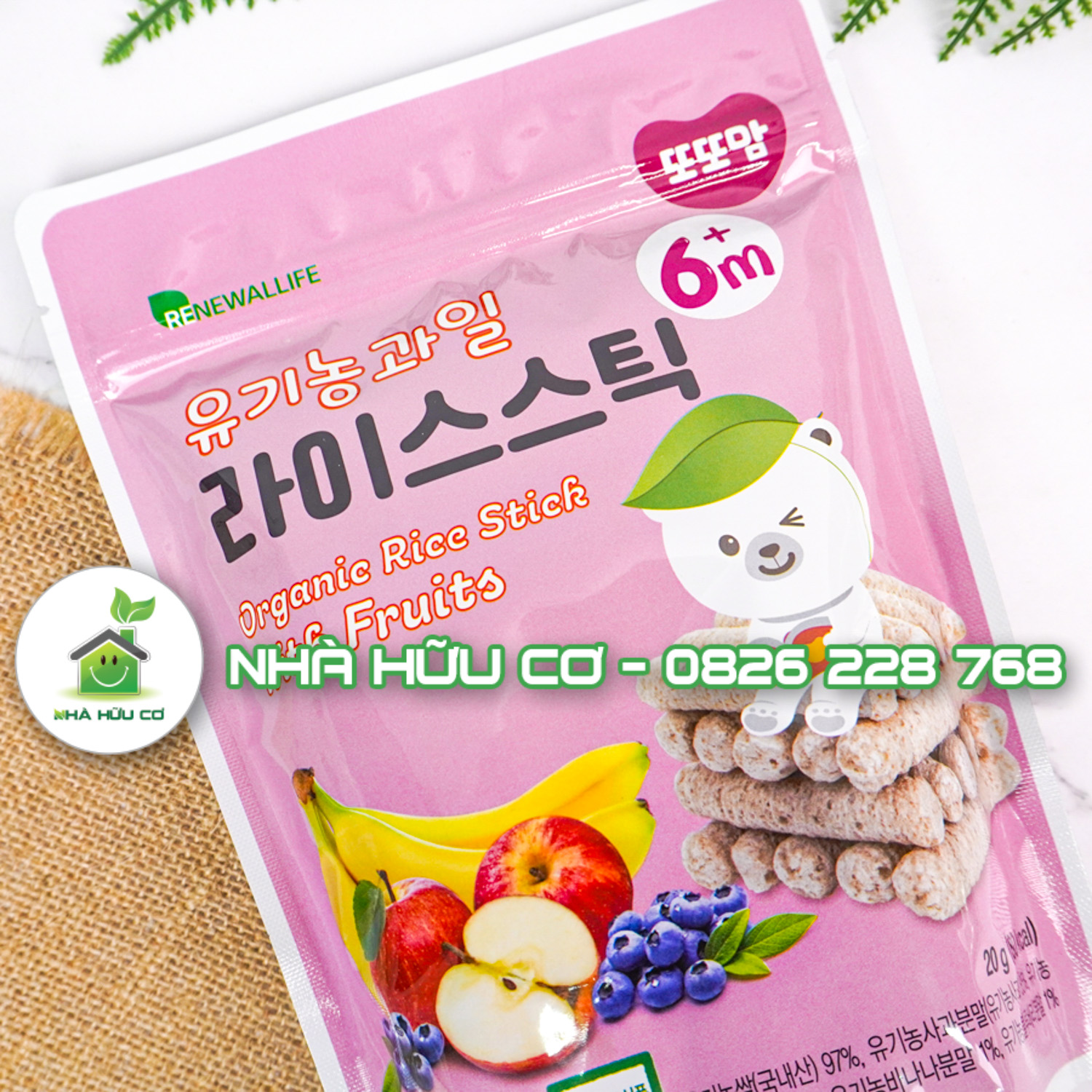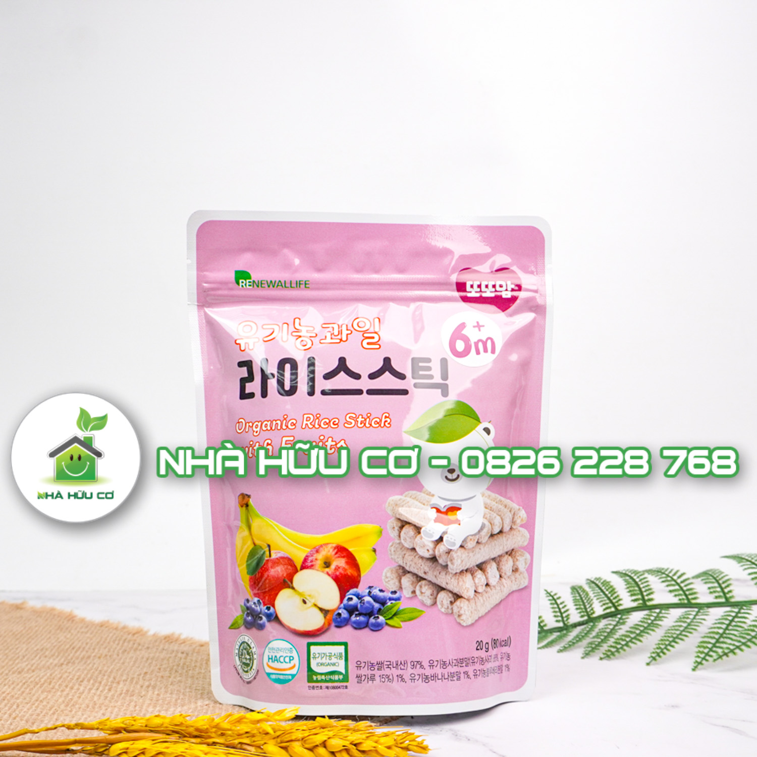 Thành phần: Gạo hữu cơ Hàn Quốc 97%, bột táo hữu cơ (1%), bột chuối hữu cơ (1%), bột việt quất (1%)