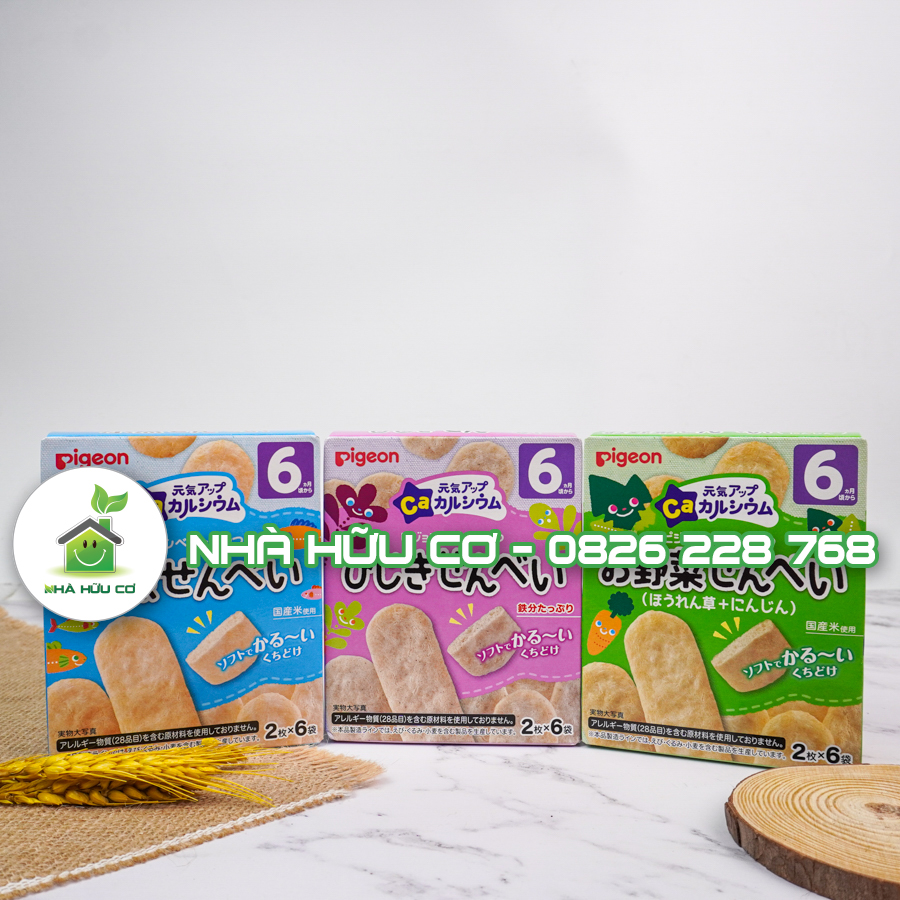 Bánh ăn dặm Pigeon cho bé 6 tháng phân loại theo tiêu chí mùi vị, có 3 vị gồm canxi cá mòi rong biển, canxi cà rốt và rau bina, canxi rong biển.