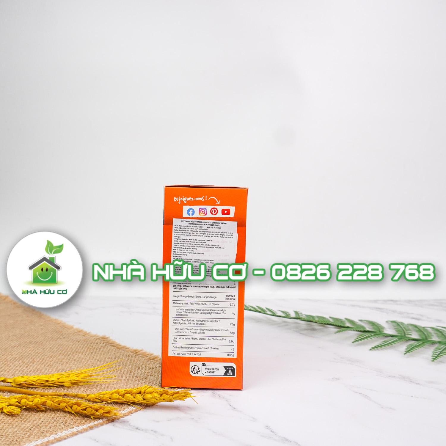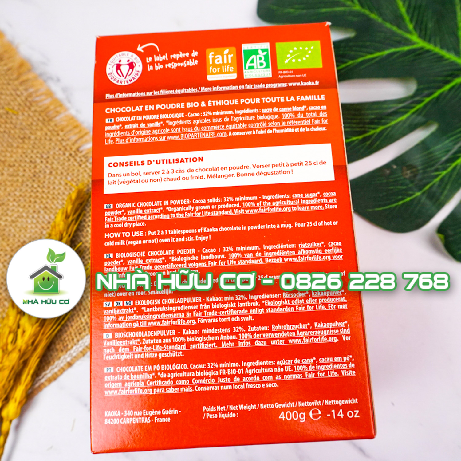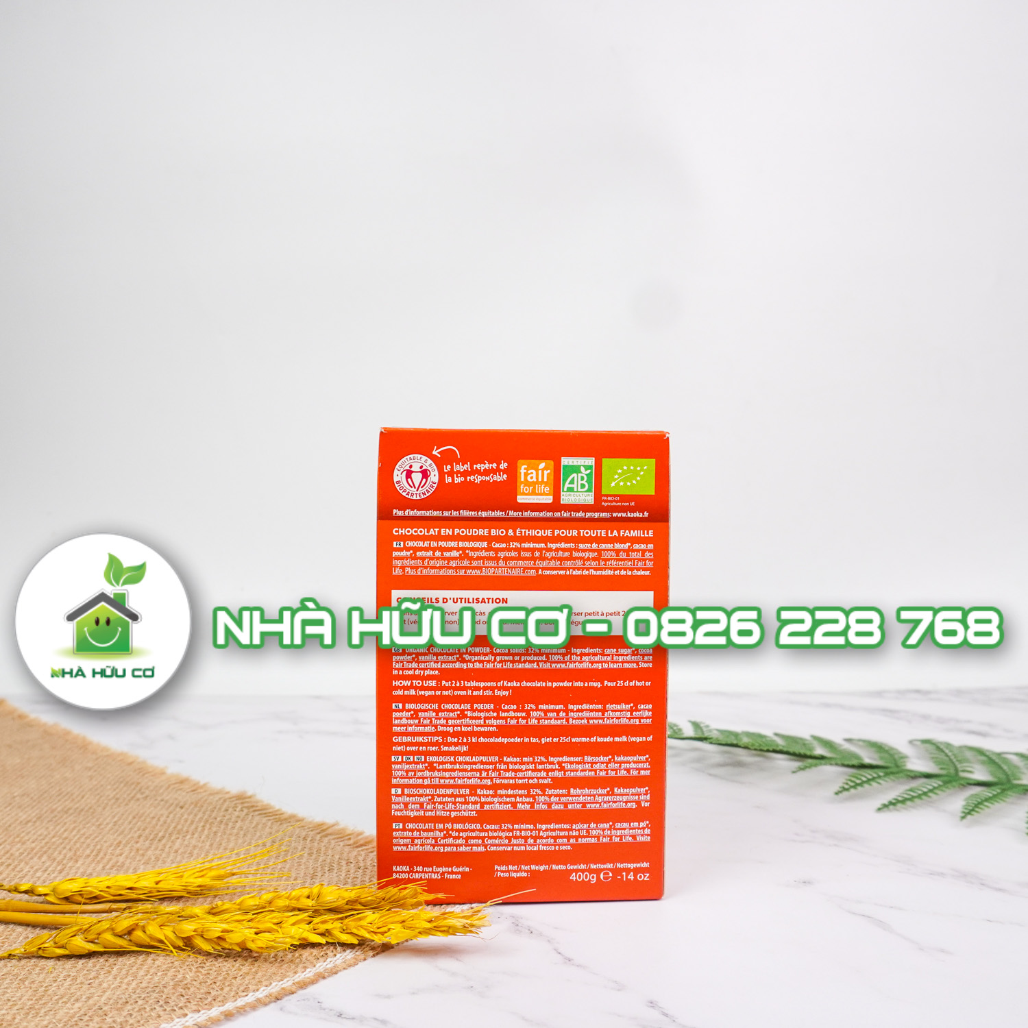 Thành phần : đường mía hữu cơ 67,9%, bột ca cao hữu cơ 32%, chiết xuất vani hữu cơ <1%.