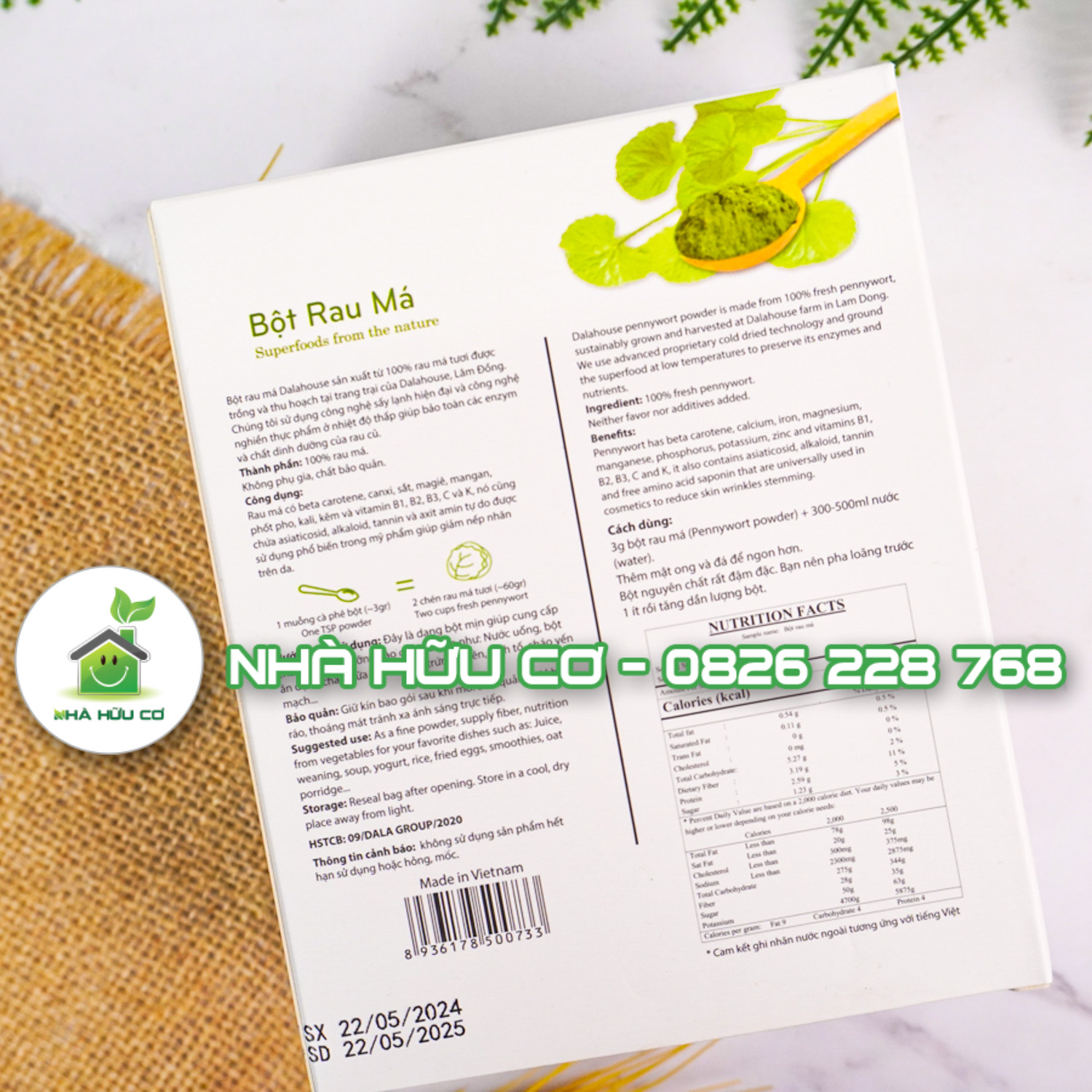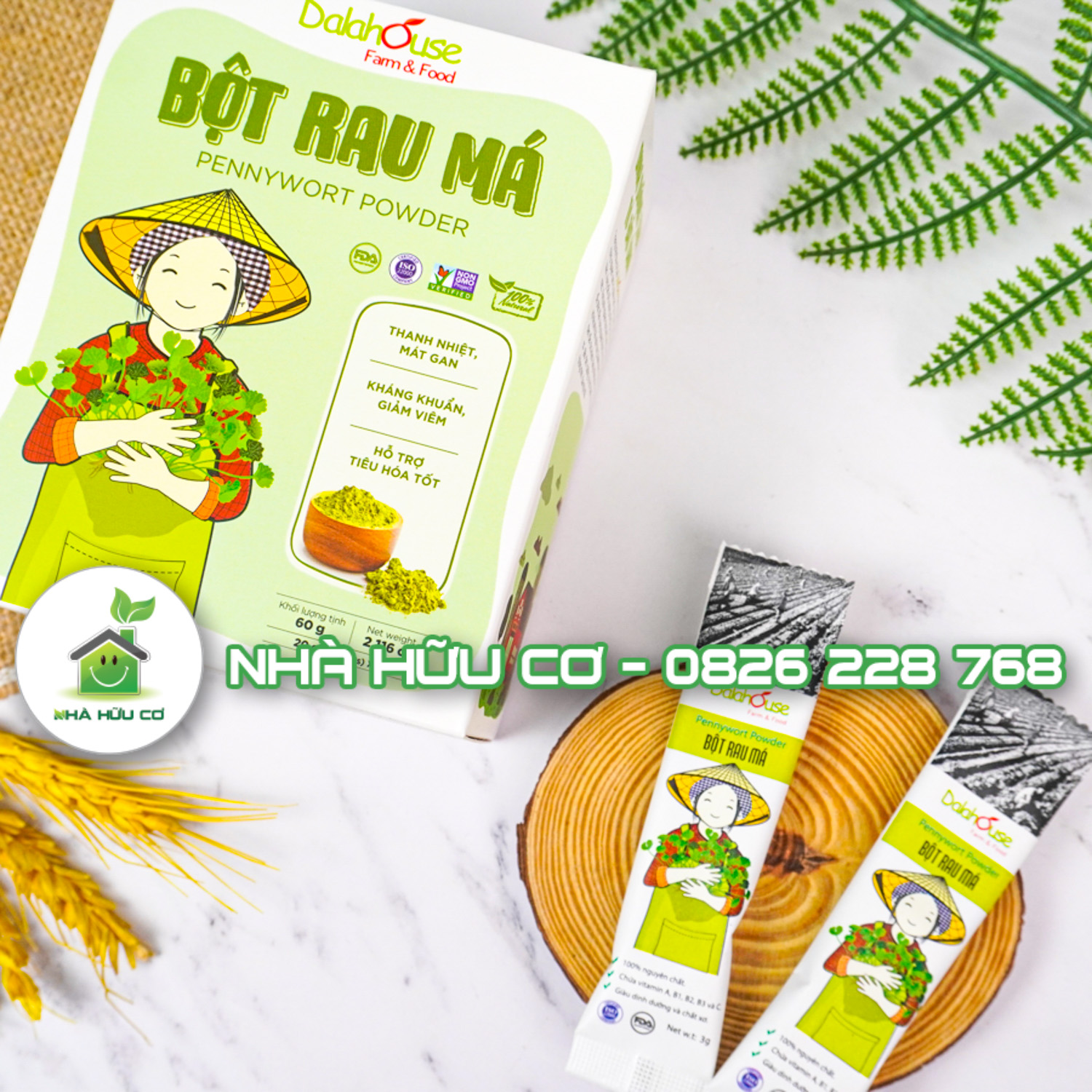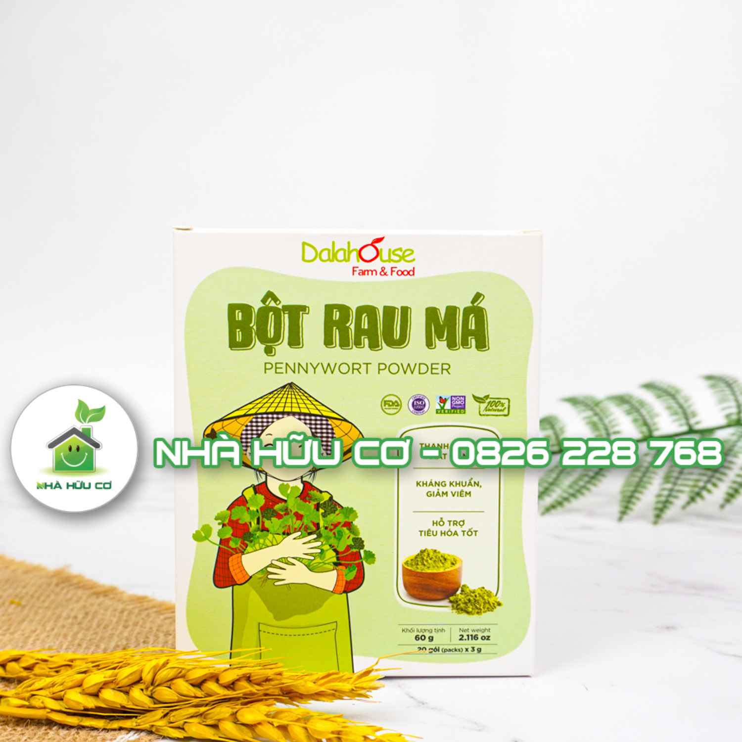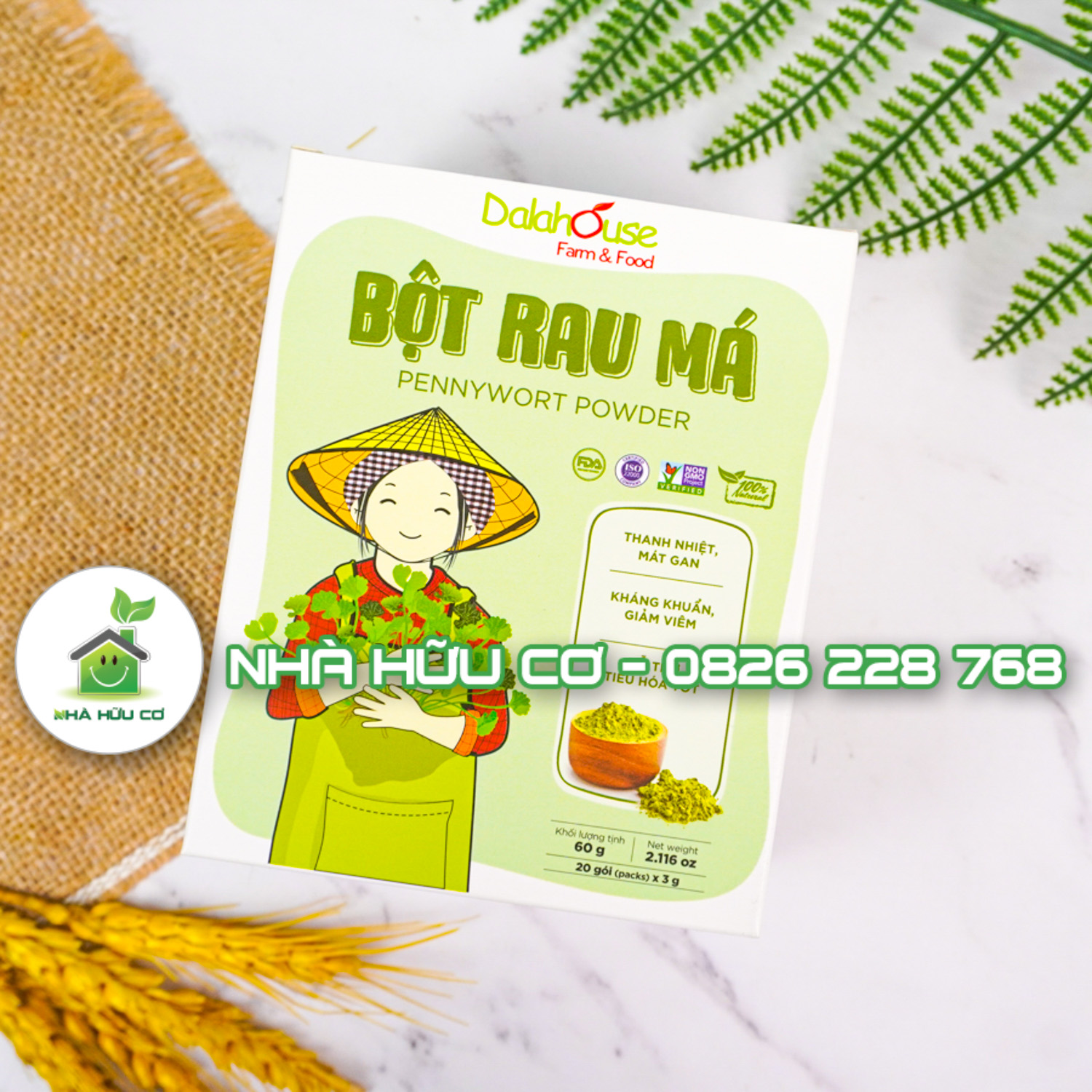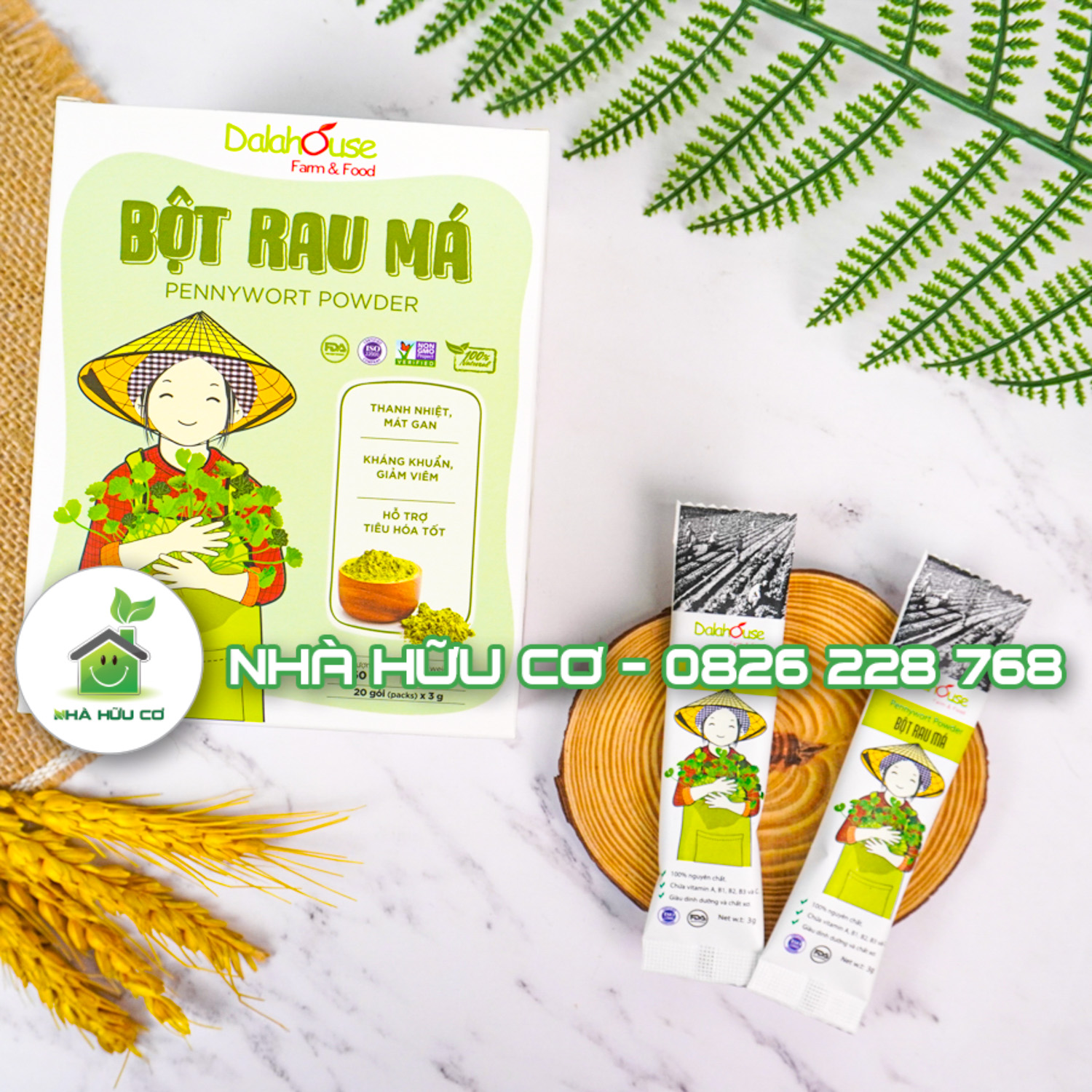 Bột rau má Dalahouse là bột rau củ đầu tiên được kiểm soát từ khâu trồng trọt đến khâu chế biến từ những nguyên liệu tươi ngon không hóa chất tại nông trại của Dalahouse, Lâm Đồng. Sản phẩm được sản xuất bằng công nghệ sấy tiên tiến, đủ điều kiện đạt tiêu chuẩn VSATTP Việt Nam và giấy chứng nhận FDA Hoa Kỳ.